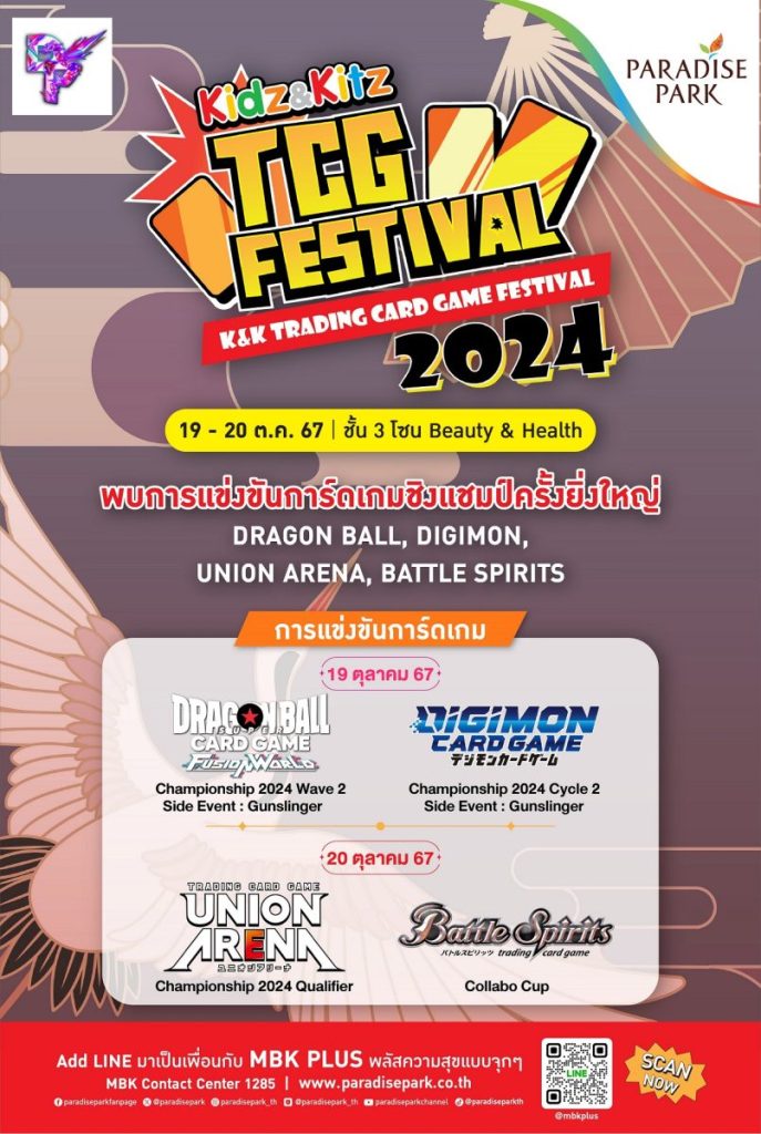 เตรียมพบกับการแข่งขันการ์ดเกมชิงแชมป์ระดับประเทศครั้งยิ่งใหญ่ พาราไดซ์ พาร์ค ศูนย์การค้าในเครือเอ็ม บี เค ผนึกพันธมิตร DP:Hobby และ Kidz & Kitz จัดงาน Kidz & Kitz TCG Festival : K&K Trading Card Game Festival 2024 ชวนเหล่าการ์ดไฟท์เตอร์ลงชิงชัยกับการแข่งขันสุดมัน ได้แก่ Dragon Ball Card Game Fusion World, Digimon Card Game, Trading Card Game Union Arena และ Battle Spirits นอกจากนี้ยังพบกับร้านค้าการ์ดเกมชั้นนำ มาจำหน่ายสินค้าและอุปกรณ์การเล่นเกม พร้อมโปรโมชันสุดพิเศษมากมาย รวมทั้งการสาธิตการเล่นเกม การแข่งขันเกมมินิเกม พร้อมลุ้นรับของรางวัลมากมาย